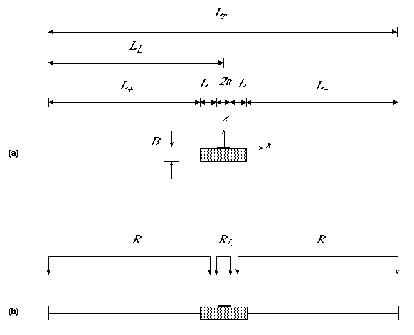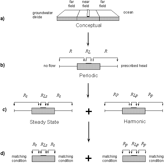 Because flow in the far field is essentially horizontal, we assume that these regions can be represented by 1D models with a transmissivity T that is spatially varying but constant in time (Figure 1b). The near field is approximated as a rectangular region, following Nield et al. [1994]. The fact that the upper surface is horizontal and fixed in time is a geometric approximation which still allows many features of the true solution to be studied.