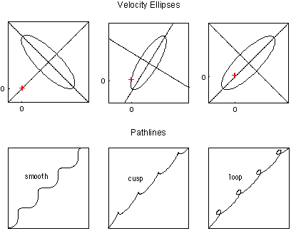 Because heads have steady and harmonic components, specific discharge and velocity also have both steady and harmonic components, in both x and z directions. Harmonic variations in velocities result in velocity and displacement ellipses (Figure 3), with a displacement ellipse being the same shape and orientation as the velocity ellipse but scaled in magnitude by a factor of P/2p or 1/w.. When superimposed on steady flow, these result in pathlines of three kinds: smooth wavy pathlines, cuspy pathlines (with particles passing through instantaneous stagnation points) and loopy pathlines (Figure 4).