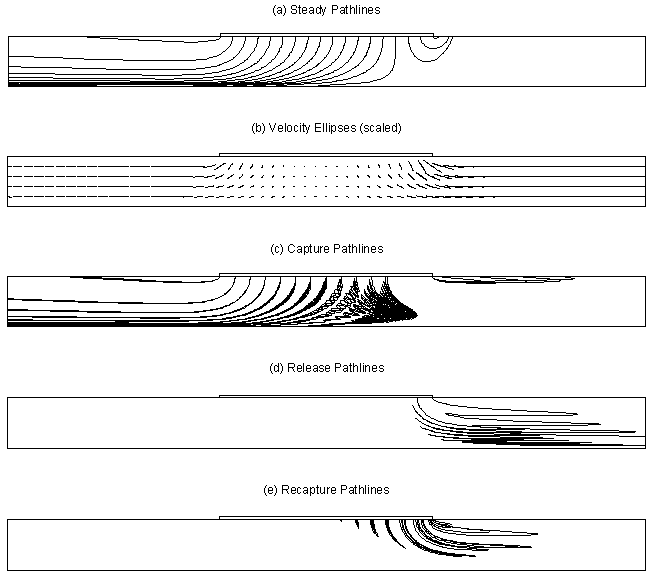 Consider a steady flow pattern with groundwater discharge toward the lake. In Nield et al.'s [1994] classification this system would be described as a discharge regime of type D4 (Figure 7a). With different sinusoidal recharge to the lake and aquifer, AQUIFEM-P predicts velocity and/or displacement ellipses as shown in Figure 7b. Superimposing the steady and fluctuating velocity fields and starting particles at a number of times through a period shows that particles can be completely captured by the lake (Figure 7c), or they can migrate from the lake into the lake's release zone (Figure 7d), or they can appear to be released by the lake, only to be recaptured at a later time (Figure 6e).